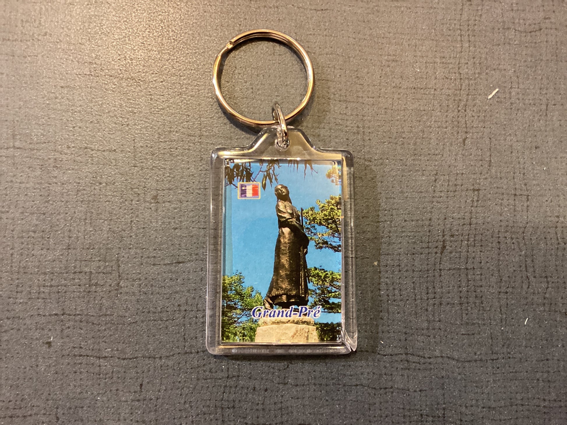 Porte-clés double face : statues de Longfellow et d'Evangeline